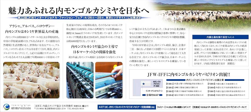 2016419日,內(nèi)蒙古自治區(qū)農(nóng)牧業(yè)廳廳長郭健在IFF報(bào)紙上寄語此次活動(dòng),希望自治區(qū)羊絨企業(yè)積極推進(jìn)以創(chuàng)新、品質(zhì)、品牌為核心的發(fā)展新模式。充分利用各個(gè)平臺(tái)廣泛交流,探討合作途徑,推動(dòng)兩國羊絨行業(yè)多方共贏,共同提升全球市場(chǎng)對(duì)羊絨產(chǎn)品的認(rèn)知度,希望我們的羊絨企業(yè)能團(tuán)結(jié)一致,實(shí)現(xiàn)羊絨產(chǎn)業(yè)的可持續(xù)發(fā)展。通過這次活動(dòng),走出一條中日羊絨產(chǎn)業(yè)創(chuàng)新之路。