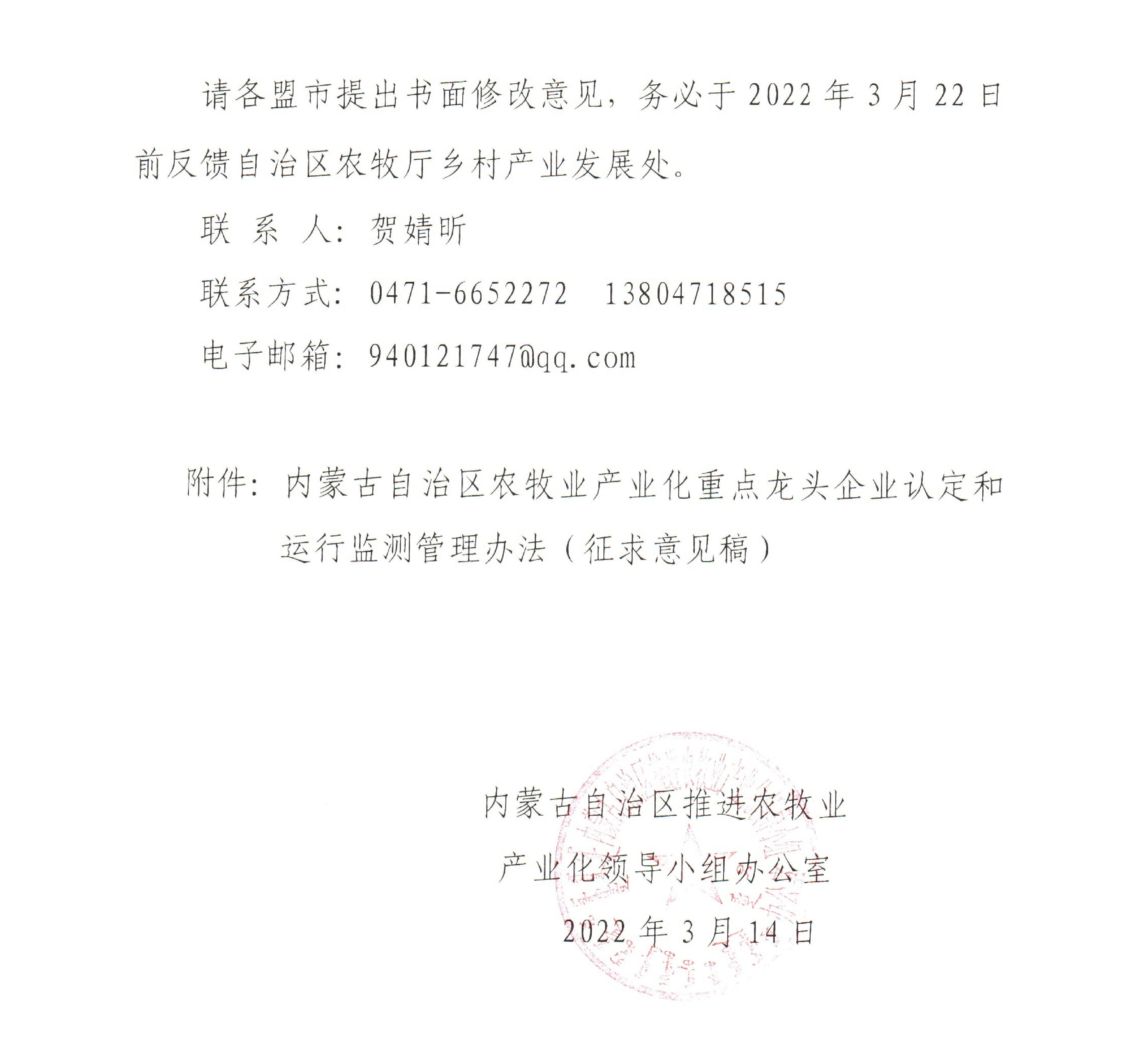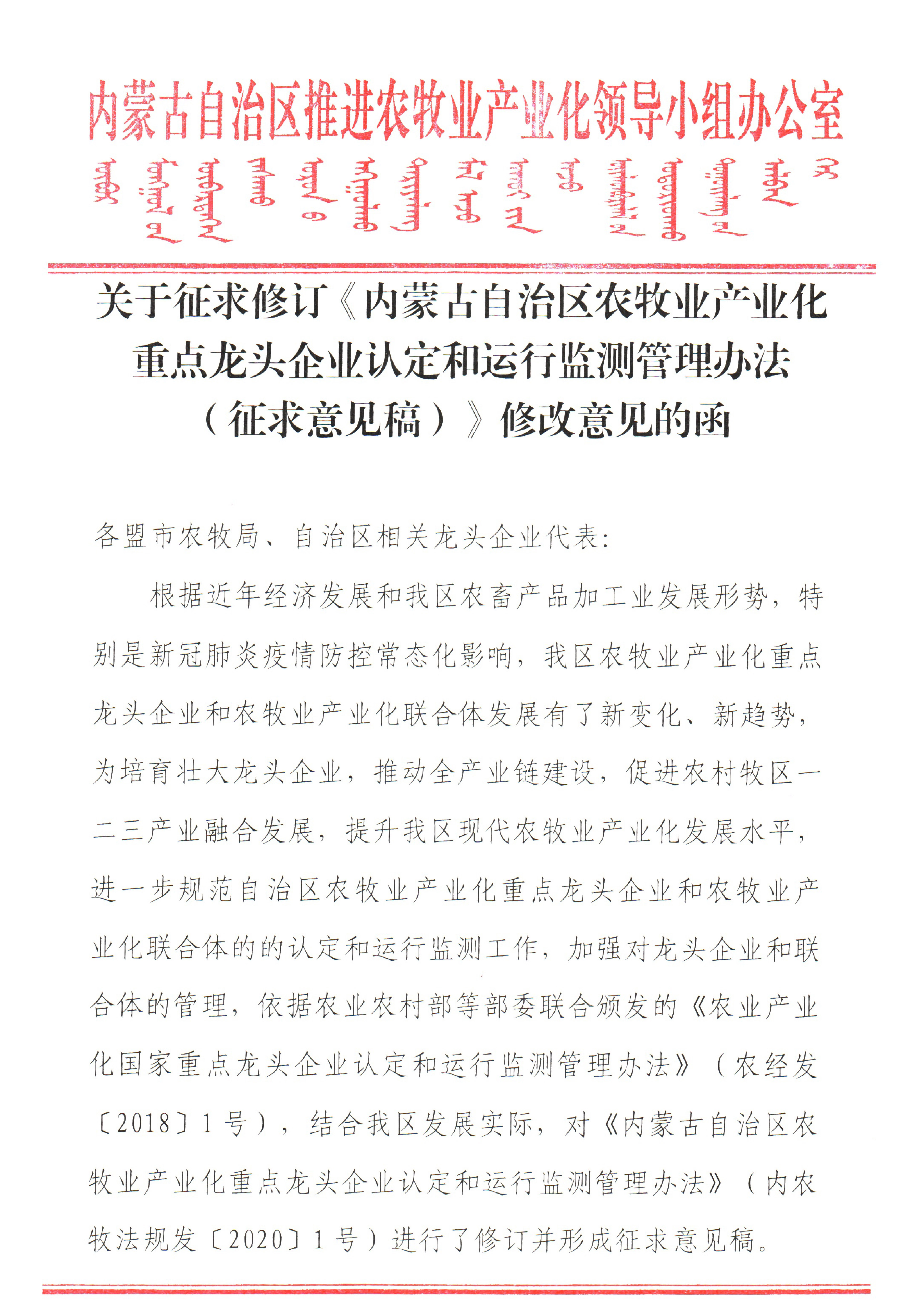標(biāo)題:關(guān)于征求修訂《內(nèi)蒙古自治區(qū)農(nóng)牧業(yè)產(chǎn)業(yè)化重點(diǎn)龍頭企業(yè)認(rèn)定和運(yùn)行監(jiān)測管理辦法(征求意見稿)》修改意見的函