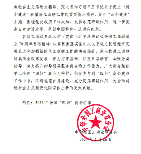 近日,中華全國工商業(yè)聯(lián)合會發(fā)布《關(guān)于認定2023全國“四好”商會的通報》,通報指出,按照全國“四好”商會建設(shè)標準,通過自下而上逐級推薦、省級工商聯(lián)審核把關(guān)和全國工商聯(lián)組織審定,認定全聯(lián)1798家商會為2023年全國“四好”商會。其中內(nèi)蒙古自治區(qū)45家商(協(xié))會獲此殊榮,內(nèi)蒙古農(nóng)牧業(yè)產(chǎn)業(yè)化龍頭企業(yè)協(xié)會榜上有名!在此,謹向關(guān)心、支持協(xié)會的各位同仁表示衷心的感謝!同時,對獲此殊榮的各兄弟商協(xié)會表示熱烈祝賀!
