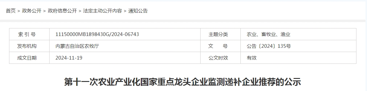 根據(jù)《農(nóng)業(yè)農(nóng)村部辦公廳關(guān)于開展農(nóng)業(yè)產(chǎn)業(yè)化國家重點(diǎn)龍頭企業(yè)企業(yè)監(jiān)測(cè)工作的通知》(農(nóng)辦產(chǎn)〔2024〕6號(hào))和《農(nóng)業(yè)產(chǎn)業(yè)化國家重點(diǎn)龍頭企業(yè)認(rèn)定和運(yùn)行監(jiān)測(cè)管理辦法》(農(nóng)經(jīng)發(fā)〔2018〕1號(hào))規(guī)定,立足我區(qū)農(nóng)牧業(yè)產(chǎn)業(yè)發(fā)展實(shí)際,我區(qū)開展了第十一次農(nóng)業(yè)產(chǎn)業(yè)化國家重點(diǎn)龍頭企業(yè)監(jiān)測(cè)審核和遞補(bǔ)推薦工作。經(jīng)第三方機(jī)構(gòu)審核、專家評(píng)審、相關(guān)九部門單位會(huì)議審查,擬推薦呼倫貝爾農(nóng)墾集團(tuán)有限公司、巴彥淖爾市圣牧高科生態(tài)草業(yè)有限公司、內(nèi)蒙古騎士乳業(yè)集團(tuán)股份有限公司、莫力達(dá)瓦達(dá)斡爾族自治旗沃豐生物質(zhì)新材料有限公司、內(nèi)蒙古阜豐生物科技有限公司5家企業(yè)遞補(bǔ)農(nóng)業(yè)產(chǎn)業(yè)化國家重點(diǎn)龍頭企業(yè)。
