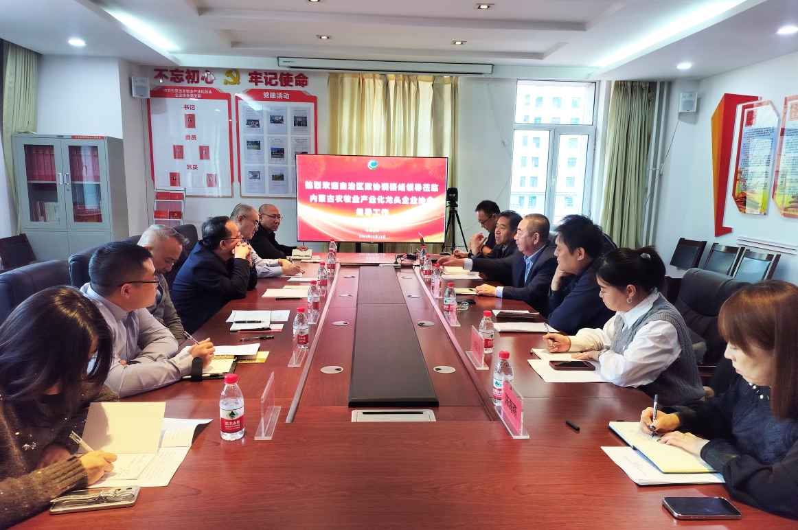 2024年12月18日下午,自治區(qū)政協(xié)委員、港澳臺(tái)僑聯(lián)絡(luò)和外事委員會(huì)主任張波,內(nèi)蒙古工業(yè)大學(xué)僑聯(lián)副主席新巴雅爾,內(nèi)蒙古航空職業(yè)技術(shù)學(xué)校校長、內(nèi)蒙古航空運(yùn)動(dòng)協(xié)會(huì)會(huì)長趙自強(qiáng),自治區(qū)政協(xié)港澳臺(tái)僑聯(lián)絡(luò)和外事委員會(huì)辦公室主任安勝利一行6人來協(xié)會(huì)調(diào)研指導(dǎo)工作,協(xié)會(huì)副會(huì)長單位內(nèi)蒙古凌志馬鈴薯科技股份有限公司總經(jīng)理閆洪志、內(nèi)蒙古民豐種業(yè)有限公司劉榮書,常務(wù)理事單位內(nèi)蒙古額爾敦羊業(yè)股分有限公司董事長助理畢欣及協(xié)會(huì)秘書處全體工作人員參加會(huì)議,會(huì)議由協(xié)會(huì)秘書長呼群主持。