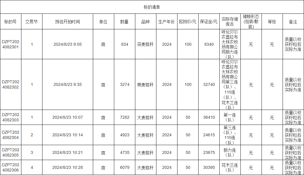 轉(zhuǎn)讓標(biāo)的為莜麥秸稈、燕麥秸稈、大麥秸稈,涉及面積莜麥秸稈834畝、燕麥秸稈3274畝、大麥秸稈(1-4標(biāo))分別為7282畝、4923畝、4735畝、6079畝,意向受讓方在競買前應(yīng)自行對標(biāo)的預(yù)估數(shù)量和質(zhì)量情況進行充分了解,交易標(biāo)的均以實際狀況為準(zhǔn)。標(biāo)的存放地位于呼倫貝爾農(nóng)墾拉布大林農(nóng)牧場有限公司,詳情見標(biāo)的清單: