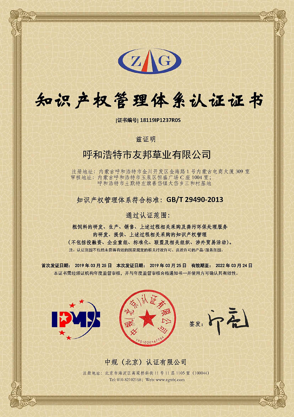 呼和浩特市友邦草業(yè)有限公司于2019年3月25日正式獲得由中規(guī)(北京)認(rèn)證公司頒發(fā)的《知識(shí)產(chǎn)權(quán)管理體系認(rèn)證證書(shū)》(證書(shū)編號(hào):18119IP1237R0S),這標(biāo)志著友邦草業(yè)在知識(shí)產(chǎn)權(quán)創(chuàng)造、運(yùn)用、管理和保護(hù)方面全面邁入國(guó)內(nèi)領(lǐng)先水平。