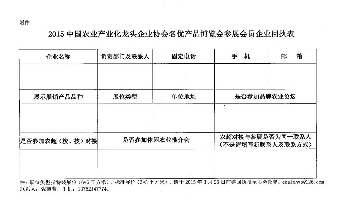 注:此次會(huì)議是針對(duì)中國(guó)農(nóng)業(yè)產(chǎn)業(yè)化龍頭企業(yè)協(xié)會(huì)(國(guó)家級(jí))會(huì)員單位提供免費(fèi)展位,其他非本協(xié)會(huì)(國(guó)家級(jí))會(huì)員須繳納一定費(fèi)用。