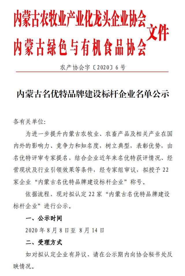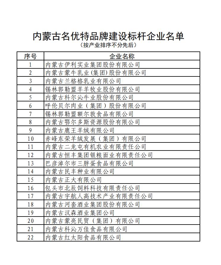 內(nèi)蒙古名優(yōu)特品牌建設標桿企業(yè)名單公示