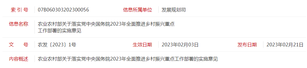 標題:農(nóng)發(fā)〔2023〕1號農(nóng)業(yè)農(nóng)村部關(guān)于落實黨中央國務(wù)院2023年全面推進鄉(xiāng)村振興重點工作部署的實施意見