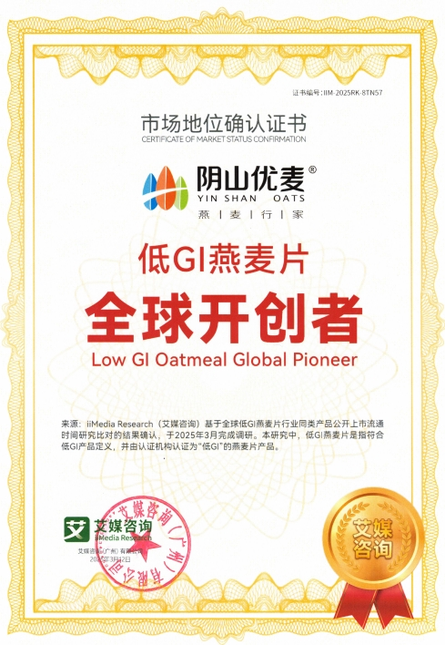 陰山優(yōu)麥此次發(fā)布的新品低GI燕麥片,是其深耕健康食品領(lǐng)域的又一力作。新品不僅通過專業(yè)機(jī)構(gòu)檢測認(rèn)證,獲得“低GI食品認(rèn)證”,同時陰山優(yōu)麥還獲得了“低GI燕麥片全球開創(chuàng)者”市場地位確認(rèn)證書。