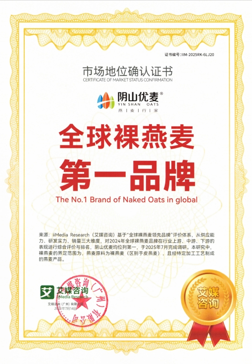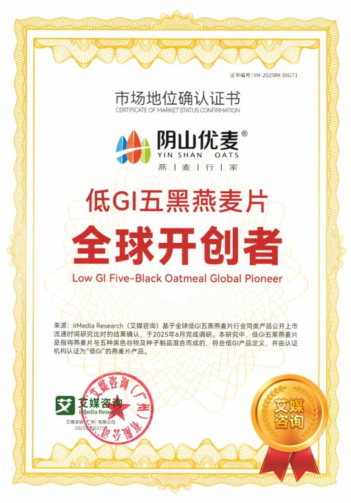 2025年7月,內(nèi)蒙古陰山優(yōu)麥?zhǔn)称酚邢薰精@得權(quán)威咨詢機(jī)構(gòu)艾媒咨詢(iiMedia Research)頒發(fā)的“全球裸燕麥第一品牌”與“中國國產(chǎn)燕麥第一品牌”市場地位確認(rèn)證書。同時,其創(chuàng)新產(chǎn)品“低GI五黑燕麥片”亦被權(quán)威認(rèn)證為全球開創(chuàng)者,標(biāo)志著陰山優(yōu)麥在全球燕麥行業(yè)取得突破性成果。